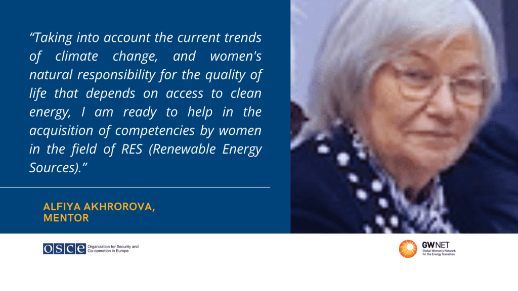 The Global Women’s Network for the Energy Transition (GWNET) is pleased to announce the mentors for the second edition of the “Empowering Central Asian Women in Renewable Energy” mentoring programme. The initiative is organised in collaboration with the Organization for Security and Co-operation in Europe (OSCE).